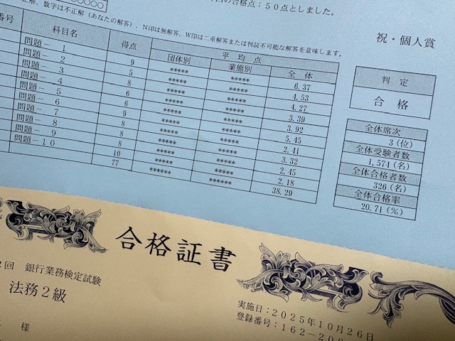 ところで、先日の銀行業務検定試験 ‘法務2級’ですが無事に合格することができました。個人賞までいただけるようで頑張った甲斐がありました。